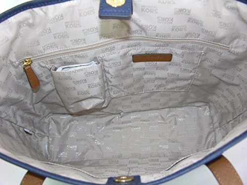 Style: Jet Set Travel Center Stripe Color: Navy/White Dimension: 14.5in (Width) x 9in (Height) x 5.5in (Depth) Handles are 8.5 inches (21 Cm) drop. Fit shoulders comfortably. Bag Features: Material: Genuine leather 20-karat gold-plated hardware. One back slip pocket. Beautiful Michael Kors Signature on front hardware plate. Magnetic snap closure. Interior is lined with signature fabric. It has a side zipped pocket, a cellphone pocket and a wallet pocket..