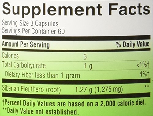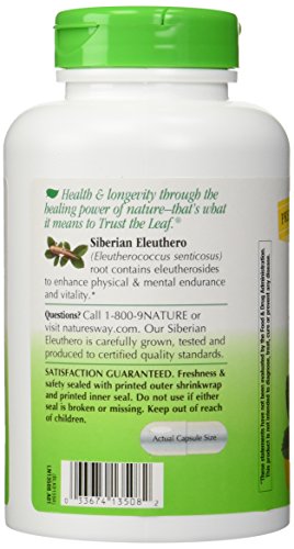 -. Binding : Health and Beauty -. Brand : Nature's Way -. Department : Health and Personal Care -. EAN : 0033674135082 -. Feature : MotherNature offers FREE Standard Shipping on orders over $25, and FREE Priority Shipping on orders over $100. See "Shipping Information" details below. -. IsAdultProduct : 0 -. IsAutographed : 0 -. IsMemorabilia : 0 -. Label : Nature's Way -. LegalDisclaimer : Information about this product is provided for informational purposes and is not meant to substitute for the advice provided by your own physician or other medical professional. You should not use the information contained herein for diagnosing or treating a health problem or disease, or prescribing any medication. You should read carefully all product packaging. If you have or suspect that you have a medical problem, promptly contact your health care provider. Information and statements regarding dietary supplements have not been evaluated by the Food and Drug Administration and are not intended to diagnose, treat, cure, or prevent any disease. All discounts are taken from sested retail prices. -. Manufacturer : Nature's Way -. Model : 033674135082 -. MPN : 033674135082 -. NumberOfItems : 1 -. PackageQuantity : 1 -. PartNumber : 033674135082 -. ProductGroup : Health and Beauty -. ProductTypeName : HEALTH_PERSONAL_CARE -. Publisher : Nature's Way -. Size : 180 Caps -. Studio : Nature's Way -. Title : Siberian Eleuthero Root 180 Caps/425 mg -. UPC : 033674135082