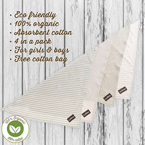 Baby Bandana Bibs Un-Dyed Organic Cotton - 4 Pack with Gift Bag by LuvdbabyOur drool bibs are a must-have for all new parents. Made from 100% organic cotton that is not dyed. Cotton grows naturally in a small number of colours which allows us to do fun stripes.