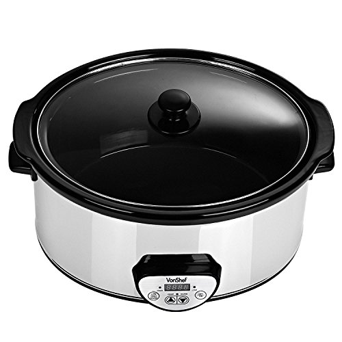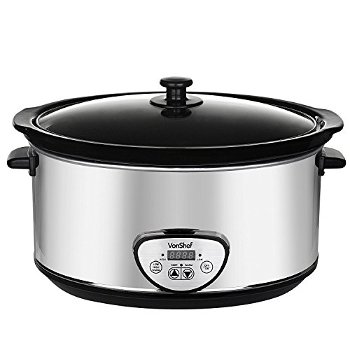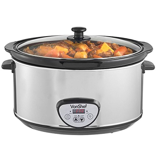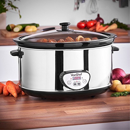VonShef 220 240 Volts Slow Cooker Crockpot Digital Automatic 6.5 Liter Large Size Stainless Steel; Removable Oval Pot, Toughened Glass Lid; Bundled with Dynastar plug adapter | 220v 240v (NOT FOR USA)