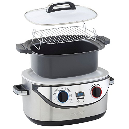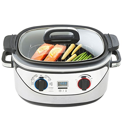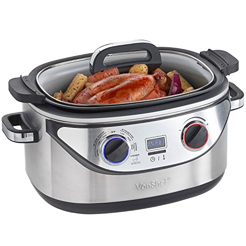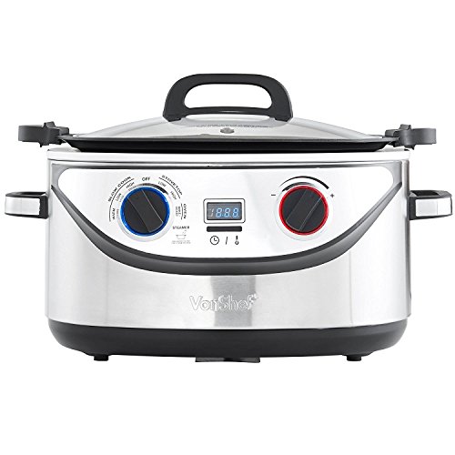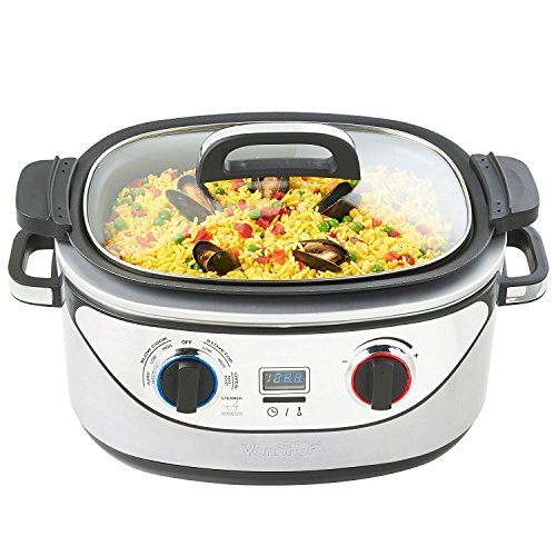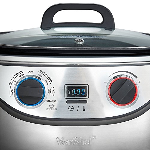 VonShef 220v 240 Volts 8 in 1 Multi Slow Cooker Crockpot Digital 5.5 Liter Large Size Stainless Steel; SLOW COOKER - SIMMER - SEAR - ROAST - BAKE - STEAM - & WARM; Bundle with Dynastar plug adapter.