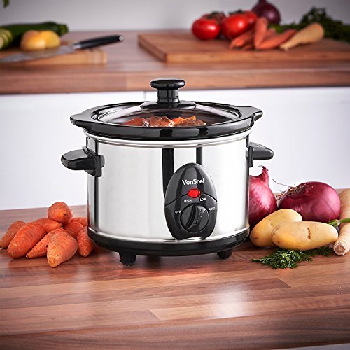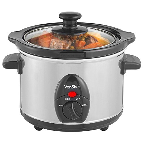 VonShef 220 240 Volts Slow Cooker Crockpot 1.5 Liter Small Size Stainless Steel; Toughened Glass Lid; Bundle with Dynastar plug adapter| 220v 240v (NOT FOR USA)