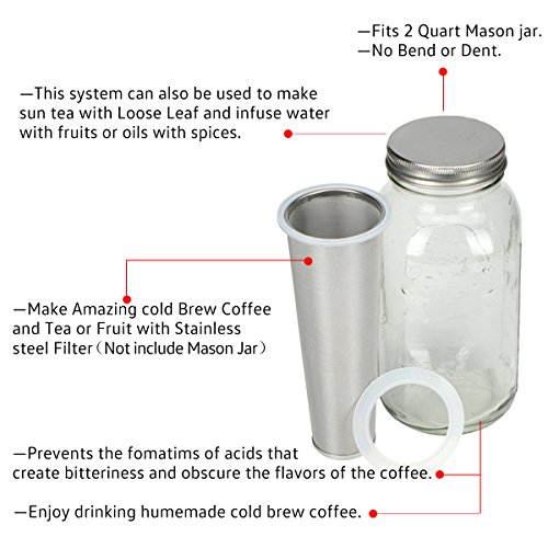 FITS ALL LARGE MOUTH MASON JARS-The 2 quart jar will yield up to 4 cups of coffee concentrate. Because we use a standard mason jar, you can add your own jar to the system to brew one batch while drinking another.This system can also be used to make hot tea or sun tea with loose leaf teas and infuse water with fruits or oils with spices.
