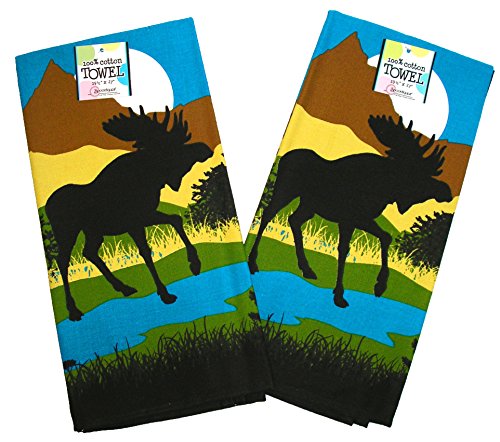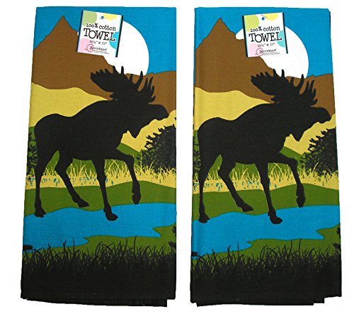 Set of 2 Spoontiques Brand Unique 100% Cotton "Moose Nature Scene" 19-1/2" x 27" Dish Towel (2, Moose)