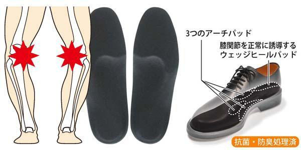 | インソールプロは、プロの技術から生まれた、足、膝、腰などのお悩みに対応するプロ仕様のインソールです。膝痛対策は、足底面の角度を「ヒールウェッジパッド」で調整し、膝関節の角度を正常な状態に誘導して膝への負担を軽減します。同時に3つのアーチを正常な状態にサポートし、足の基本骨格を守ります。 |
