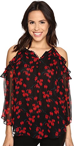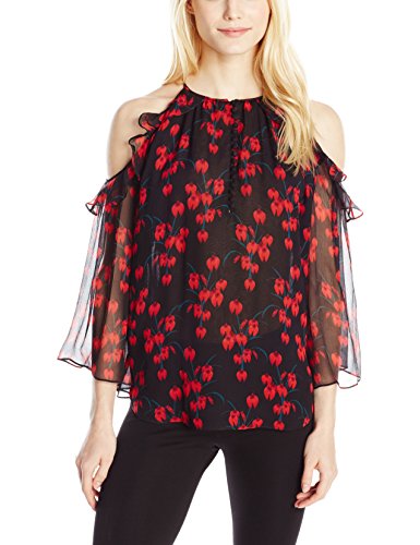 Blouse in sheer orchid print featuring high neckline with Victorian-inspired button placket and cold-shoulder cutouts with ruffled trim