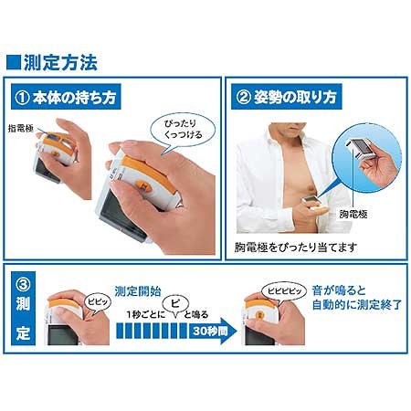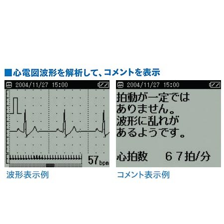 -. Feature : ご家庭で測りたいときに、すぐに約30秒間の心電図波形が測定できます。 / 測定した心電図波形を解析して、結果メッセージを表示します。 / 医師の参考となるクリアな心電図波形を表示します。 / 測定5回分を本体に保存できます。 ※SDメモリカード(メーカー動作保証済み)により、メモリ数を増やせます。 / 安定した測定ができるようデザインされています。