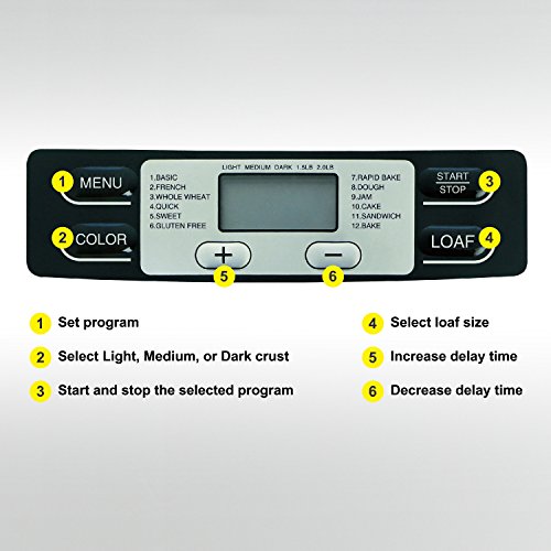 Programmable bread machine bake loaf sizes: 1.5 lbs, 2 lbs. Built-in Auto Fruit and Nut dispenser