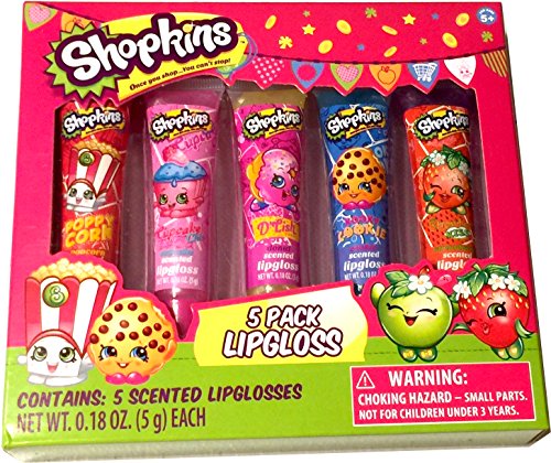 These Shopkins lip gloss tubes are perfect for any child over the age of 3. Item includes 5 tubes of lip gloss with all of the top Shopkin characters on them including Poppy-Corn, Cupcake Chic, D'Lish Donut, Kooky Cookie, and Strawberry Kiss.Feature