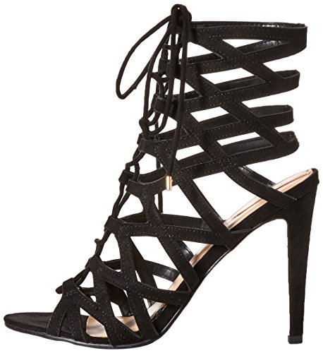-. Feature : Gladiator-inspired heeled sandal with cagey upper featuring lace front with tie closure / Open heel counter / Covered high heel