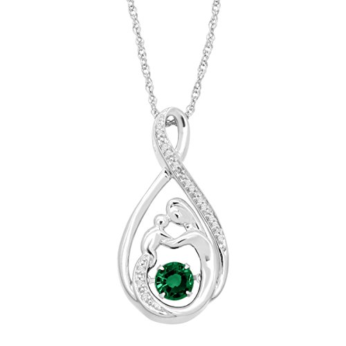 Gift the most important woman in your life a thoughtful piece that represents cherished memories and the love between a mother and child! This precious, sentimental mother and child pendant features a ⅜ carat created emerald and flashing diamond accents in a setting of sterling silver, the perfect combination of durability and shine. This piece measures 1 1/8 by 9/16 inches and comes with a sterling silver 18-inch rope chain, finished with a spring ring clasp. It's dainty enough for everyday wear, yet the shining gemstone and classic diamond accents make a truly sparkling statement.