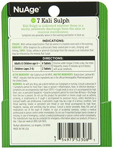 -. Title : NuAge Homeopathic #7 Kali Sulph Potassium Sulphate Tablets, Natural Symptomatic Relief of Cough, Earache, and Sinus Congestion, 125 Count