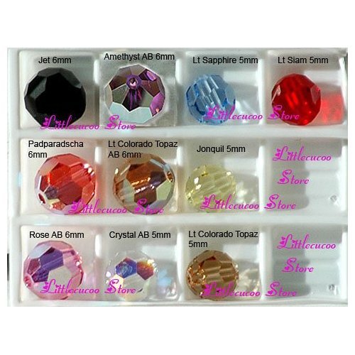 + Quantity: 100 beads total. 10 beads of each color. + Size: 5mm & 6mm. + Colors: 5mm: Crystal AB, Jonquil, Lt Sapphire, Lt Colorado Topaz, Lt Siam. 6mm: Rose AB, Jet, Lt Smoke Topaz AB, Lt Amethyst AB, Padpardadscha ABFeature