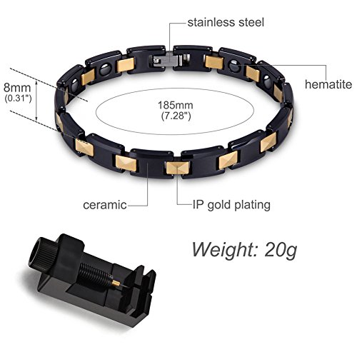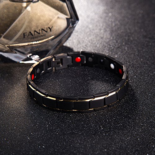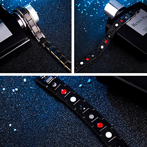-. Feature : NATURAL ARTHRITIS PAIN RELIEF-- Can Provide Natural Pain Relief from Arthritis, Rheumatism, RSI, Tendonitis, Carpal Tunnel Syndrome, Golfers and Tennis Elbow or Poor Circulation.Reduces Aches and Pains in the Wrist and Finger Joints Caused by Excessive Keyboard Typing and Computer Use. / EXCELLENT QUALITY MATERIAL: Pure Titanium with Black plated, low maintenance metal which is perfect for everyday wear .Titanium will not irritate your skin or cause the allergic reactions. / SIZE: 8.66" Can Fits Most Men Wrist. Also with Free Link Remover Tool - allows you to adjust the size in the comfort of your home / BEAUTIFUL PACKAGE: Come in an elegant Deep Blue Velvet gift box , Perfect for any gift giving occasion, great gift for Husband, Boyfriend, Father, Grandfather. Teens or Seniors and so on on Christmas Day, Birthday, Valentines Day, Anniversary, Thanksgiving Day, etc, or just as a surP.R.Ise to remind that special one how much you care. / RETURN POLICY: 30-Day 100% MONEY BACK GUARANTEE & FREE SHIPPING. In case of any dissatisfaction, you can get a full refund. If you have any question please contact us, we will respond within 24 hours.