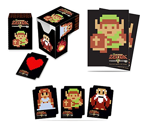 -. Brand : Unknown -. EAN : 0613449553053 -. Feature : Deck Box: Top loading Deck Box with full flap cover. Holds 82 cards in Deck Protectors sleeves. Acid free, durable polypropylene material. Includes one matching divider. / Deck Protector Sleeves: Ultra PRO sleeves are produced with archival-safe polypropylene materials and sized 66mm X 91mm to store and protect standard sized gaming cards. Packaged in 65 count packs and featuring three new designs, these deck protectors shield your cards as you wage battle against your foes. / Divider Pack: 15 Card Dividers featuring the 3 Designs of Zelda 8-Bit characters. -. IsAdultProduct : 0 -. Label : up -. Manufacturer : up -. ProductGroup : Toy -. ProductTypeName : COLLECTIBLE_CARD -. Publisher : up -. Studio : up -. Title : Ultra Pro The Legend of Zelda 8-Bit Bundle: Full View Deck Box, Deck Protectors Sleeves & Dividers -. UPC : 613449553053