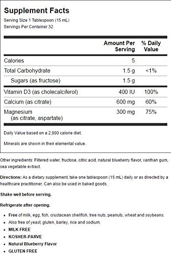 Bluebonnet's Liquid Calcium Magnesium Citrate Plus Vitamin D3 provides calcium in a chelate of calcium citrate (600 mg), as well as magnesium (300 mg) in a chelate of magnesium citrate and magnesium aspartate. Plus, this formula contains vitamin D3 (cholecalciferol) (400 IU) from natural lanolin. Available in an easy-to-swallow liquid form with naturally delicious fruit flavors for maximum assimilation and absorption.Feature