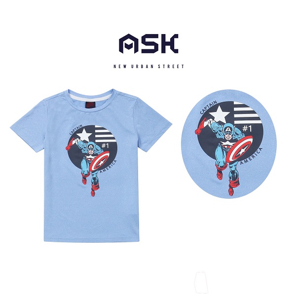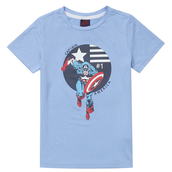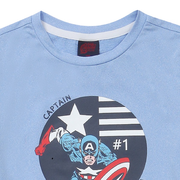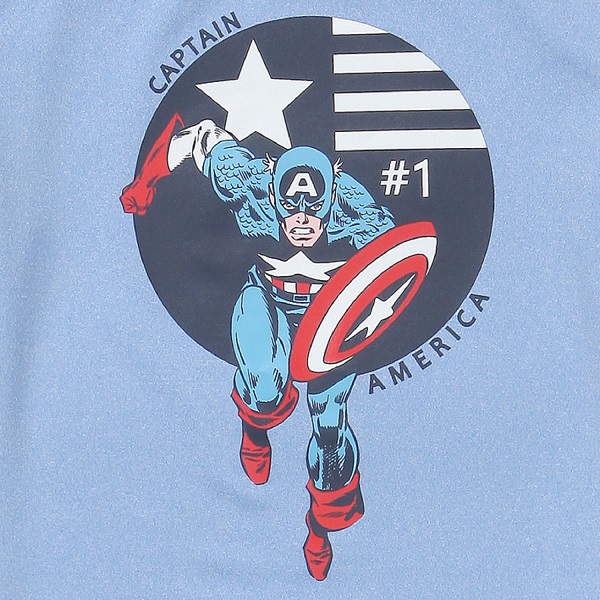 역동적인 캡틴 아메리카 케릭터로 포인트를 준 남아 티셔츠입니다.