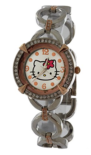 Too cute. Simulated crystal accents give this Hello Kitty bangle watch a darling look. Add feminine flair to any ensemble when you wear this women's gold-tone watch. Round Two-tone sunray dial with Hello Kitty graphic lends a cute look. Silver-tone hands and Arabic and marker numerals allow easy reading. Details: Quartz movement. Battery operated. Silver-tone case Link. Stainless steel caseback. Manufacturer's 1-year limited warranty. Not appropriate for children 14 years old and younger.