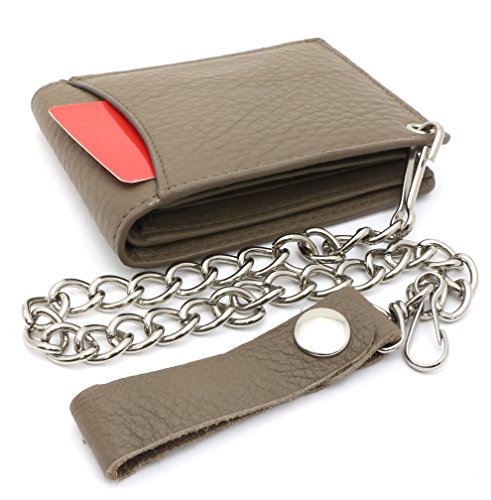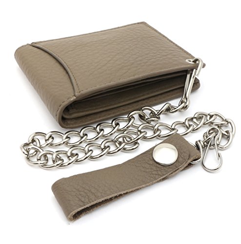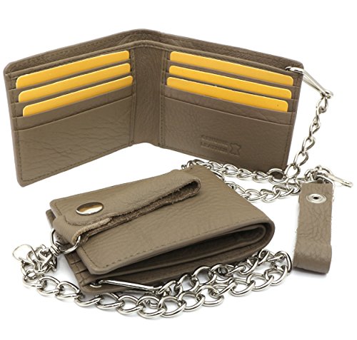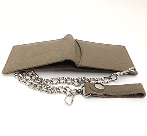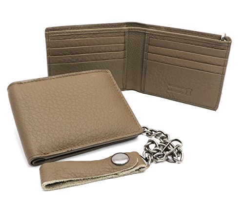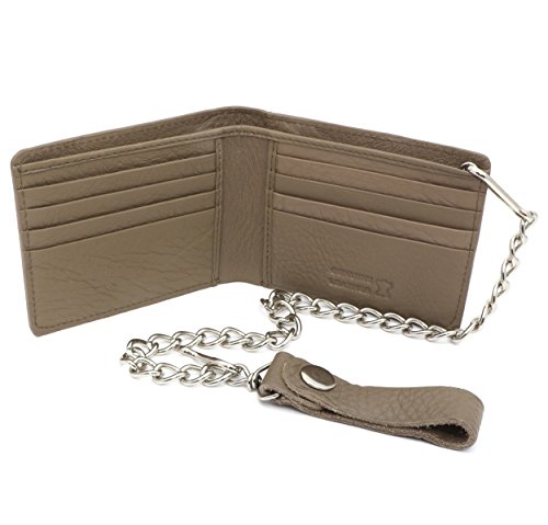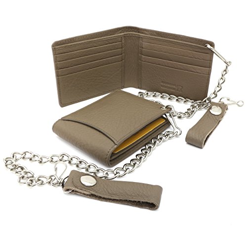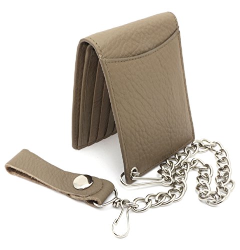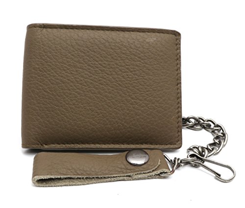 Product DescriptionBifold taupe genuine leather wallet with 12 inch removable chain. Includes 1 cash pocket, 2 coin pockets, 8 card slots, and an outer pocket. W-17-10
