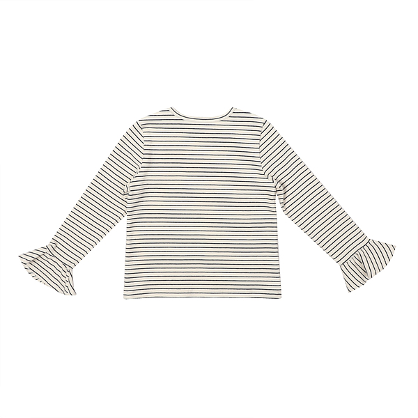 스트라이프소재로 캐쥬얼하게 코디되면서 소매끝부분이 프링장식으로 되어 러블리한 느낌으로도 코디되는 상품입니다.