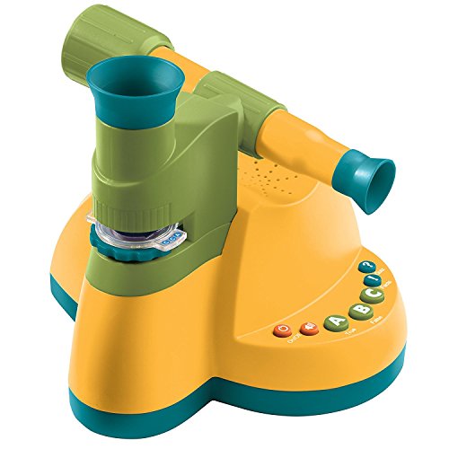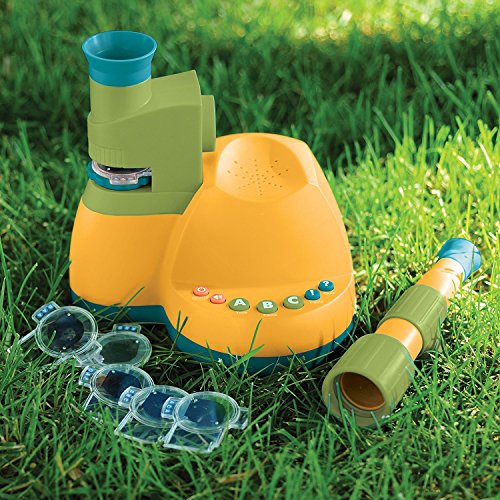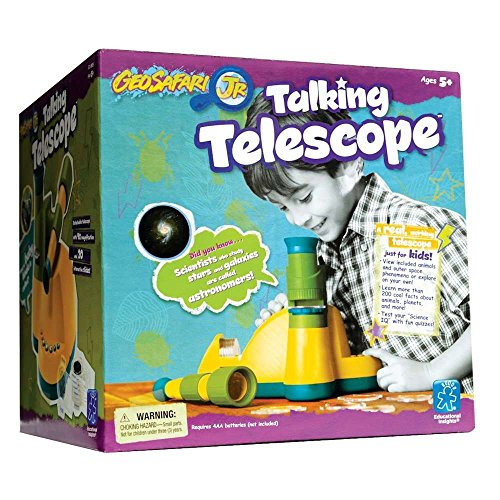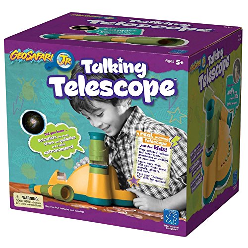 Get an up-close view of 12 animals and 8 space-age phenomena, including images from NASA. Includes detachable telescope with 4x magnification, more than 200 fun facts, and an interactive quiz mode. Requires 4 AA batteries (not included). Ages 5+. With the GeoSafari Jr. Talking Telescope, kids get an up-close VIEW of 12 animals and 8 space-age phenomena. They can HEAR cool facts or TEST their knowledge in fun quiz games. Features beautiful images from NASA, built-in storage for all 20 slides, detachable telescope (4x magnification) for on-the-go exploring, and battery-saving automatic shut-off. Two motivating game modes, Facts and Quiz, speak 200 fun facts and questions with realistic sound effects. Requires four AA batteries (not included).Feature