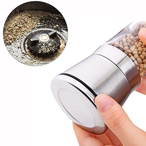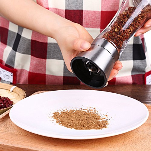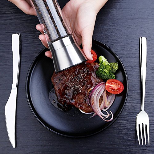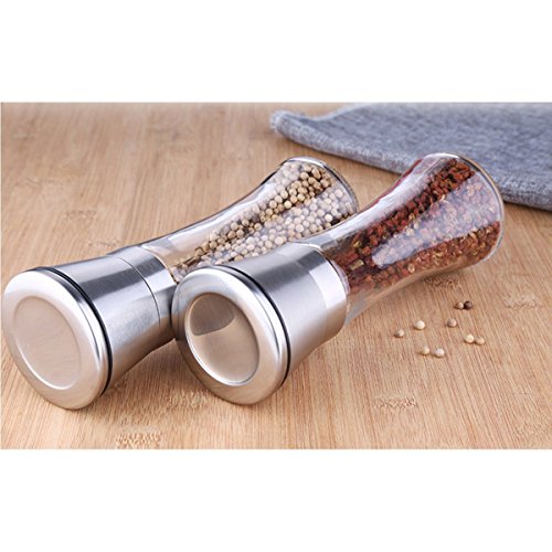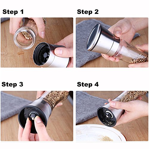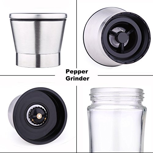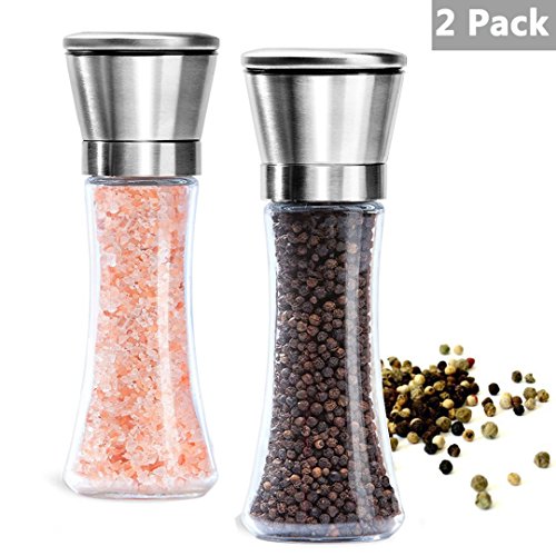 - GREAT SALT AND PEPPER GRINDER DESIGN: This set is made of stylish tall glass premium brushed stainless steel, elegant design will look cool on any kitchen table.