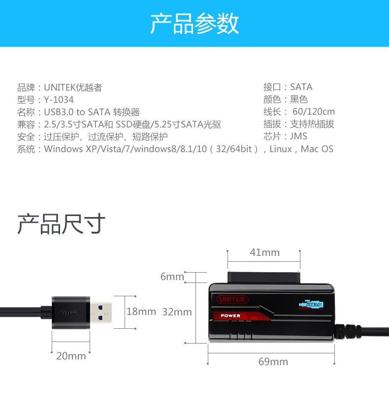优越者USB3.0转SATA数据线硬盘易驱线转接线2.5/3.5寸光驱转换器