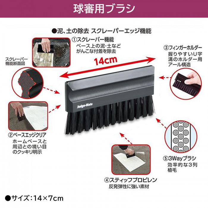 現役の審判員のアドバイスからできた審判用品です。角丸デザインで使いやすいボールバッグや、泥・土・砂を除去するブラシなど、球審の必需品のセットです。 |