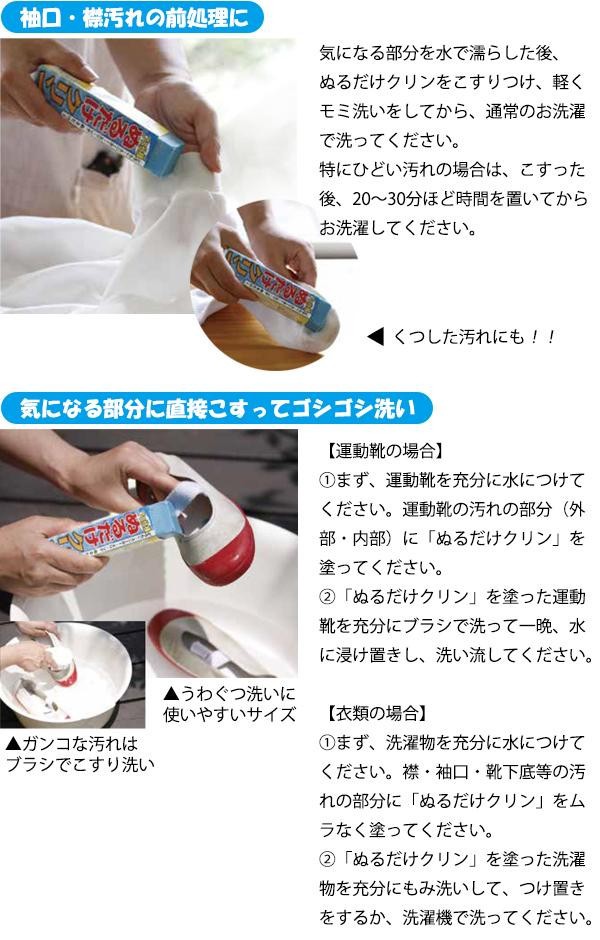 手軽に部分洗いができる棒状洗浄剤です。袖口・襟汚れや、くつした汚れの前処理に!!うわぐつや運動靴には、気になる部分に直接こすってブラシでゴシゴシこすり洗いしてください。 |