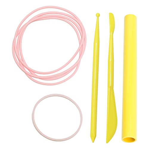 Contents: 6 clay colors: red, orange, ivory, blue-green, purple, & bonus color black (total weight of 40g), 2 silicone necklaces, 1 glow-in-the dark silicone bracelet, 1 roller, 2 tools, 9 shape cutters, 1 baking sheet, 1 play mat, & instructions