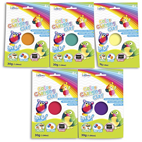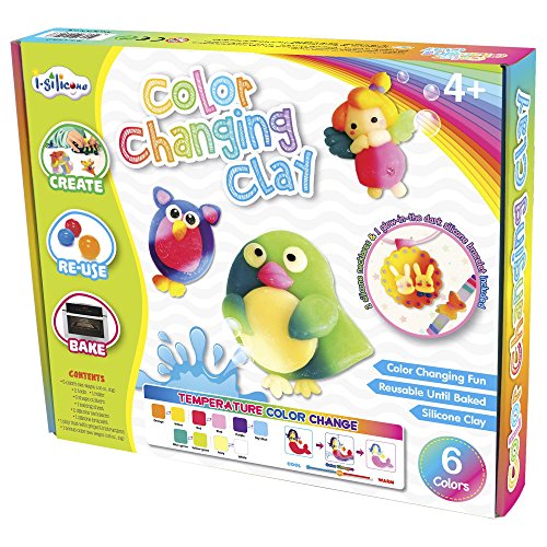 Reveal color-shifting mysteries and have double the fun with the I-Silicone Color Changing Clay. Watch your clay creations change color by temperature -- dip them in warm or cool water, run an ice cube over them, refrigerate clay and warm them with your hands, and more. Comes with five color-shifting shades of clay, plus bonus black and everything needed to bake clay creations to keep or make jewelry with two silicone necklaces and one glow-in-the dark silicone bracelet.