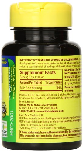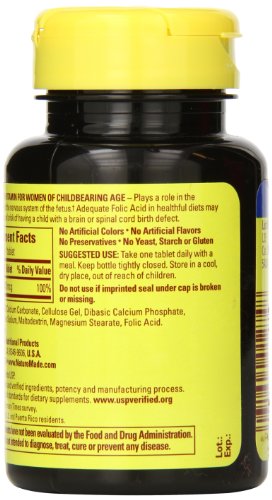 -. Binding : Health and Beauty -. Brand : Nature Made -. Department : Diet & Nutrition -. EAN : 0031604012748 -. Feature : Recommended as part of woman's daily regimen for health, stress, mood, and prenatal care / Aids in development of nervous system in fetus / May play a significant role in heart health / Always take in conjunction with B12 supplement / null -. IsAdultProduct : 0 -. Label : Nature Made -. Manufacturer : Nature Made -. Model : 1274 -. MPN : 1274 -. NumberOfItems : 1 -. PackageQuantity : 1 -. PartNumber : 1274 -. ProductGroup : Health and Beauty -. ProductTypeName : HEALTH_PERSONAL_CARE -. Publisher : Nature Made -. Size : 250 -. Studio : Nature Made -. Title : Nature Made Folic Acid 400mcg, 250 Tablets -. UPC : 885190534883