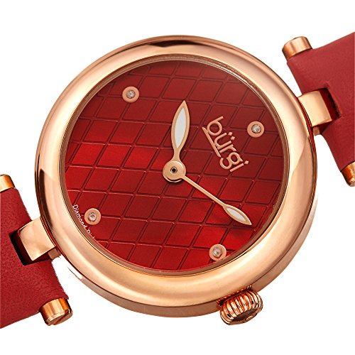 This gorgeous Burgi timepiece features a polished rose gold tone case with a lovely diamond-patterned dial. Each of the genuine diamond markers is hand-applied to the red dial, and the classic two-hand timekeeping is powered by a quality quartz movement. It is completed with a red genuine leather strap that is affixed with elegant barbell-style lugs.