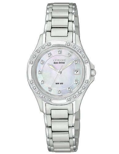 -. Feature : Eco drive technology is fueled by light and it never needs a battery / 31 diamonds / Mineral crystal / Case diameter 26 millimeters / Water resistant to 330 feet (100 M): suitable for snorkeling, as well as swimming, but not diving
