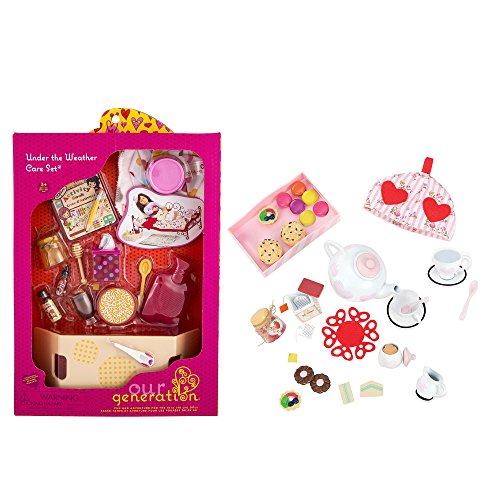 -. Feature : A HIGH TEA IN FASHION - You can throw a proper tea party at a moment's notice with the Our Generation Tea for Two Set. Your 18" doll will be the hostess with the mostess, having lots to offer her favorite gal pal. Please note: dolls not included. / GET WELL SOON WITH HOME REMEDIES! - No one likes being sick at home, but everyone appreciates a good care-giver! Rest up and get back to feeling like yourself again with the Under the Weather Care Set! Please note: doll not included. / TRUSTED QUALITY - All our dolls, clothes, and accessories are made with safe, carefully-chosen, high-quality material. They're easy to clean and maintain and are shipped in eco-friendly packaging. They can be collected, cherished, and also recycled the old fashioned way (by being passed on). For more information see our website. / OUR GENERATION MISSION - We're dedicated to a new, multifaceted generation of girls who are playing hockey, getting involved in charities, dressing fashion-forward, and still finding time to, you know, be kids! Our Generation is much bigger than an 18" doll. It's about an extraordinary generation of girls growing up, learning, playing, and changing the world together. / FULLY COMPATIBLE WITH MOST 18" DOLLS - All Our Generation dolls, clothes, horses, and accessories are fully compatible with most 18" dolls, including American Girl dolls and accessories. These products can be mixed and matched interchangeably without noticeable difference.