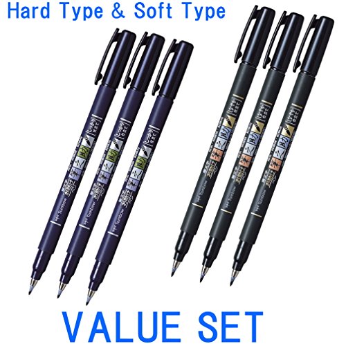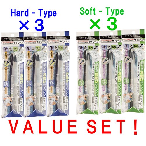 Tombow Fudenosuke Brush Pen - Hard Type & Soft Type Earh 3 Pens Total 6 Pens Arts Value set.