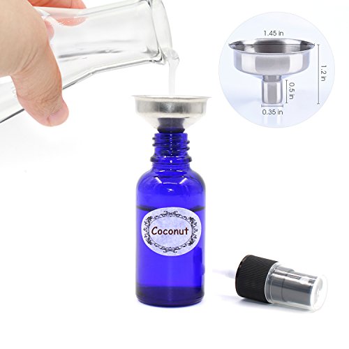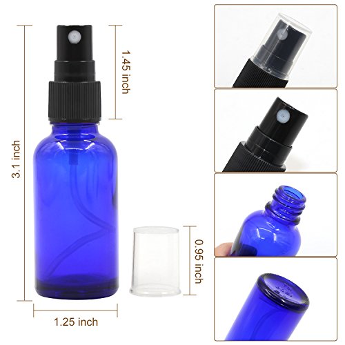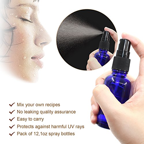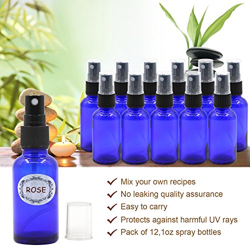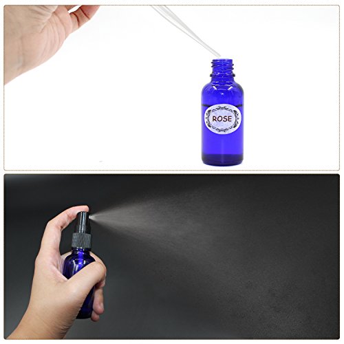 Packaged: 12* 1oz Cobalt Blue Glass Sprayer Bottles with fine mist sprayer 12* Bottle Labels 2* Extra Black Fine Mist Sprayers 2* Stainless Steel Mini Funnel 2* 3ml Transfer Pipettes