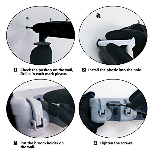 - Easy to install - You can install it easily just in 4 steps within minutes. Firstly, check the position on the wall; secondly, drill a hole in each mark place; thirdly, install the plastic into the hole; lastly, put the broom holder on the wall, tighten the screws. Please do not over tighten the screws as the holder is made of plastic.