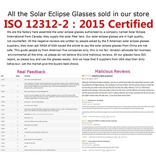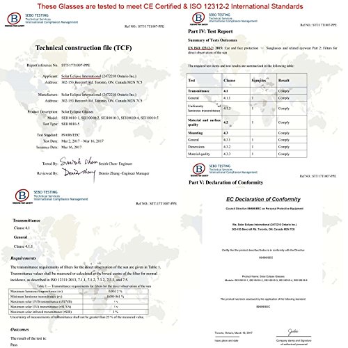 ★ SAFETY FIRST: Our glasses have been constructed with a prior safety, and allow you to view the total solar eclipse with absolute confidence. CE and ISO certified for direct sun viewing, scientifically tested and certified to meet the Standard for ISO 12312-2:2015.