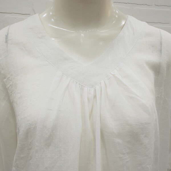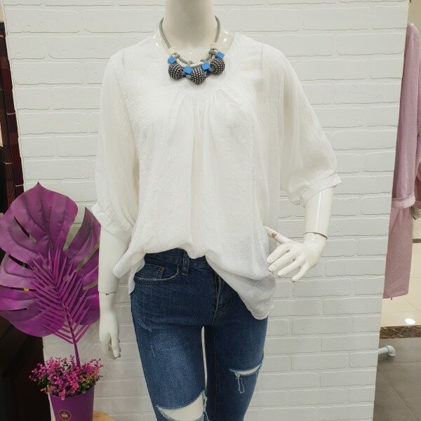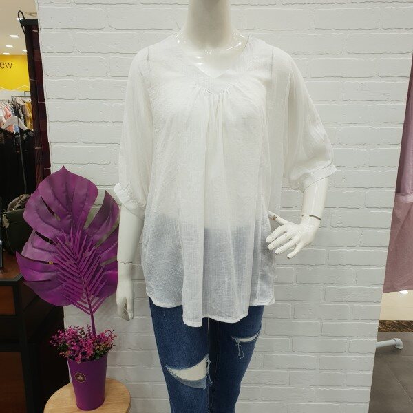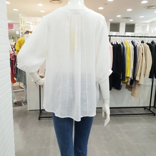 깔끔하게 떨어지는 라인의 심플한 블라우스예요.V넥 네크라인이 목선을 가늘고 여리여리 하게 연출해주며 목선과 뒷라인의 과하지 않은 셔링이 밋밋하지않고 멋스럽게 연출해줘요.루즈한핏감과 힙선까지 덮는 기장감이 팬츠랑 입으실때도 편하고 좋으실꺼예요.부드럽고 시원한 소재감이 여름까지 입기 정말 좋아요.