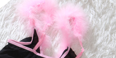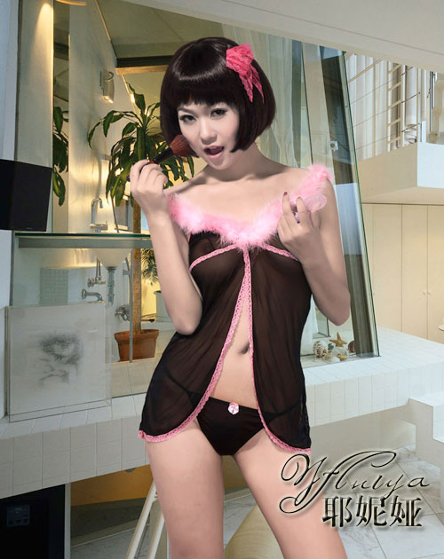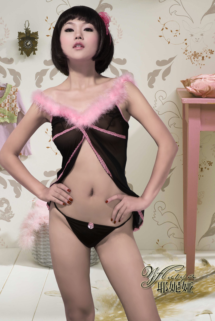 粉红色绒毛肩带,整体镶嵌蕾丝花边,透明薄纱面料,可爱性感无极限,下身配同质地小裤,轻如薄翼的内衣遮不住你那性感的胴体,隐私之地的若隐若现,外加上妩媚多情的眼神和性感可爱的媚态,让他怎能抗拒你的诱惑. |