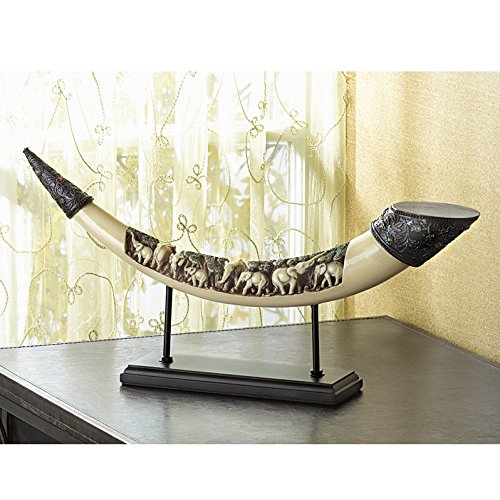A family of elephants pauses beneath a mighty banyan grove, taking the time to enjoy the cool shade - and a luscious leafy mid-day meal! Faux-ivory tusk makes a wonderfully worldly focus piece, adding a touch of the wild to your decor. Handsome tooled end-caps set with sparkling gems elegantly offset the intricate carvings and graceful shape of this simulated elephant tusk. Polyresin. 16 1/2" x 2 3/4" x 8" high.