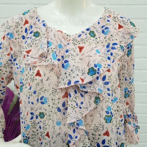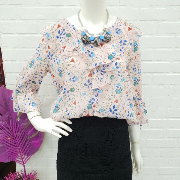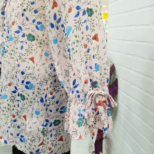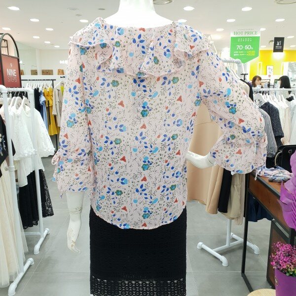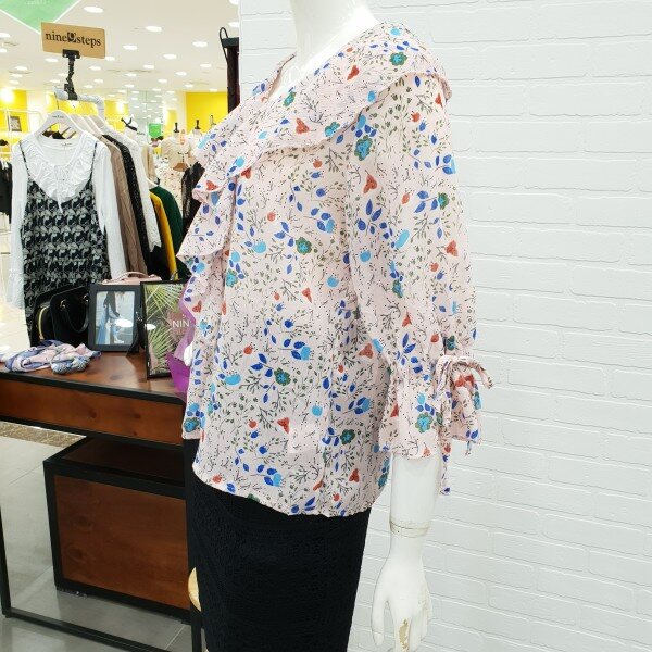 화사함이 느껴지는 블라우스예요.잔잔한 꽃 무늬가 여성스러움과 화사함을 주니 얼굴 톤 까지 밝아 보이는 블라우스죠.7부 소매에 얇은 쉬폰 소재로 시원하게 여름까지 입기 너무 좋아요.