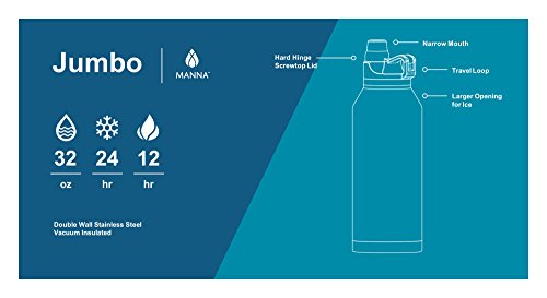 PREMIUM VACUUM INSULATION TECHNOLOGY - The Manna Jumbo water bottle is the solution to preventing iced water getting warm and hot coffee cool off. Made from premium food grade 18/8 stainless steel, your drink can stay piping hot up to 12 hours or icy cool up to 24 hours.