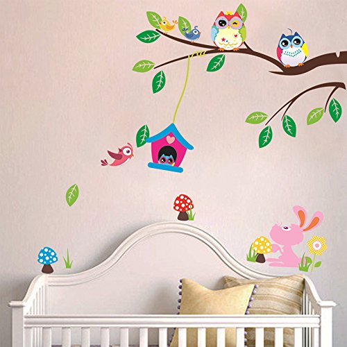 -. Title : Owls Birds Green Leaves Tree Wall Decal PVC Home Sticker House Vinyl Paper Decoration WallPaper Living Room Bedroom Kitchen Art Picture DIY Murals Girls Boys kids Nursery Baby Playroom Decor