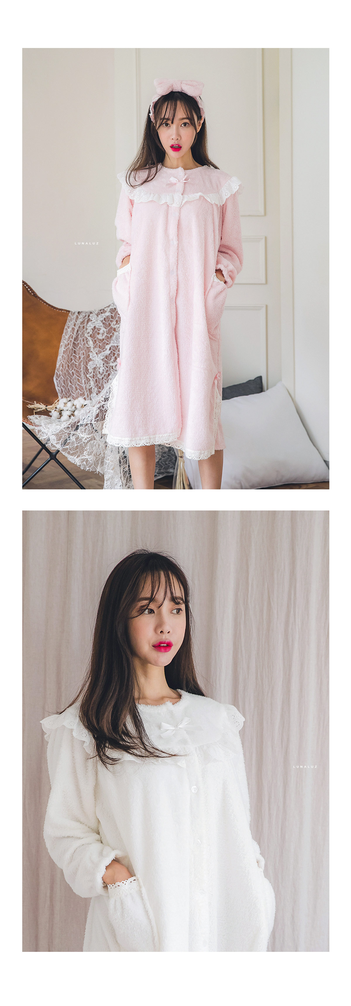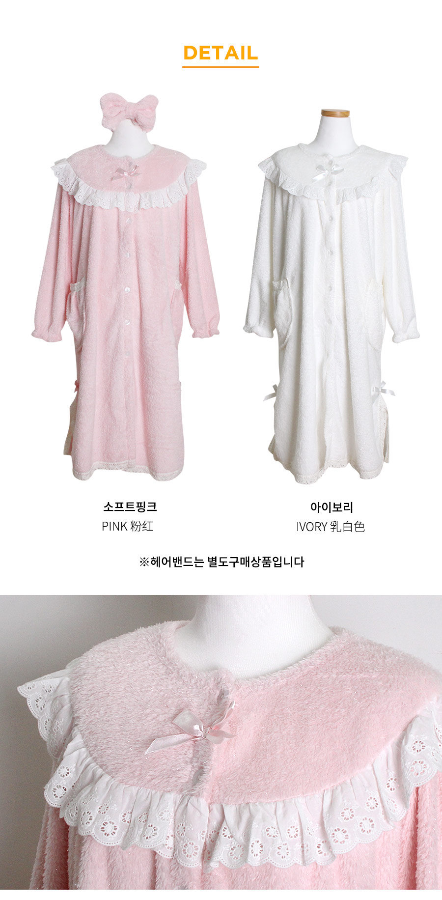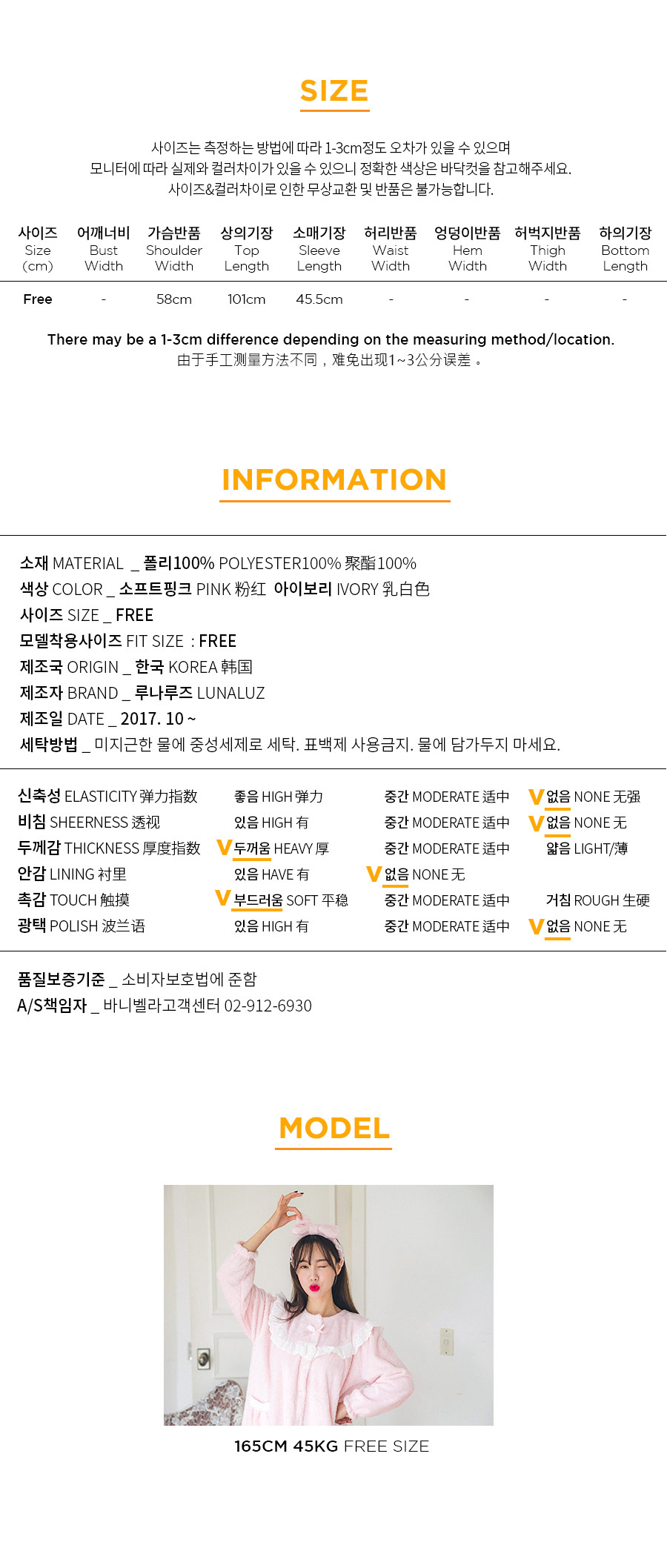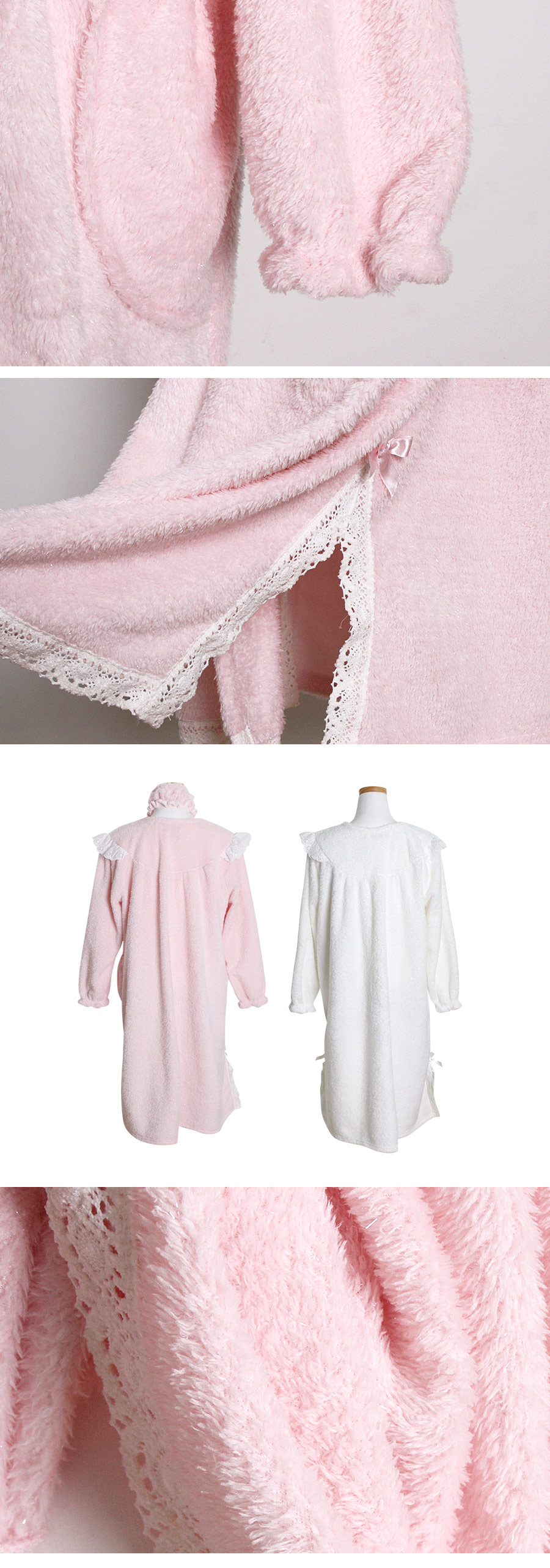 깔끔한 컬러의 보아극세사 원단에 은사를 함께 짜 포인트를 주었습니다. 빛에 따라 은은하게 빛나는 은사와 어우러져 톤 업 효과를 줍니다. 컬러는 여성스러운 무드의 소프트핑크 컬러와 화사한 화이트 컬러 2가지로 제작했습니다. 두께감이 두껍지 않으면서 보온성을 갖춘 보아 극세사 잠옷입니다. DETAIL깔끔한 네크라인 처리와 어깨라인에서 바스트로 이어지는 레이스 장식이 고급스러움을 더해주는데요. 전체 오픈형으로 탈 착용이 좋고, 원피스의 끝단 양 사이드를 절개해 고가의 캐미컬 레이스 장식을 봉제해 포인트를 주었습니다. 리본을 달아 마무리 하고, 포인트 포켓을 달아 디자인했습니다. 팔목에 밴딩 처리를 해 활동성을 높여주었습니다. 전체적으로 소재감이 우아하고 페미닌한 무드가 풍기는 고급스러운 디자인의 잠옷으로 적극 추천해드리고 싶습니다. 100% 국내 제작으로 소재, 디자인, 봉제의 퀄리티가 높습니다.SIZE여성 사이즈는 평균 44반~66 size에게 적합한 free 사이즈 입니다.