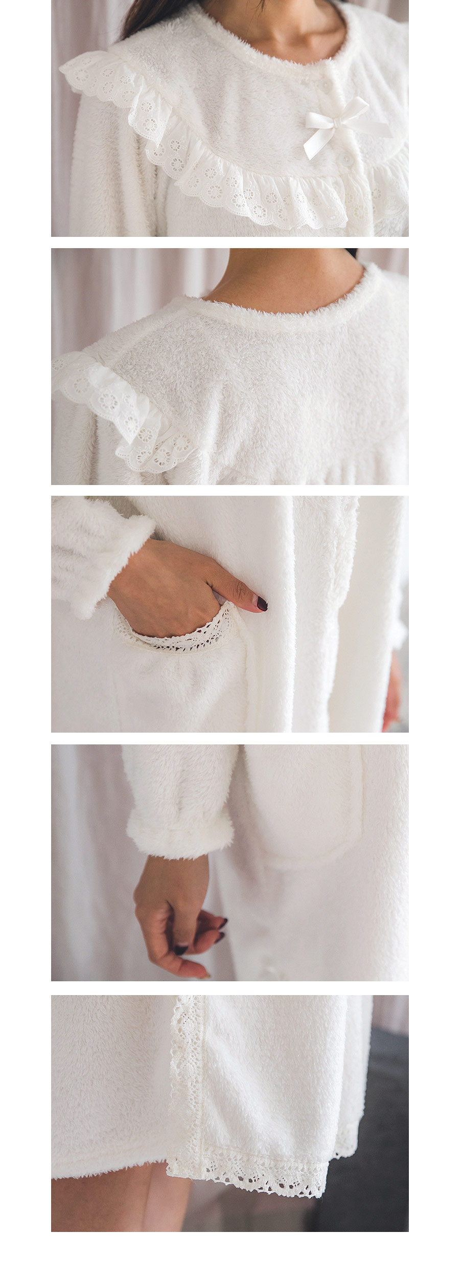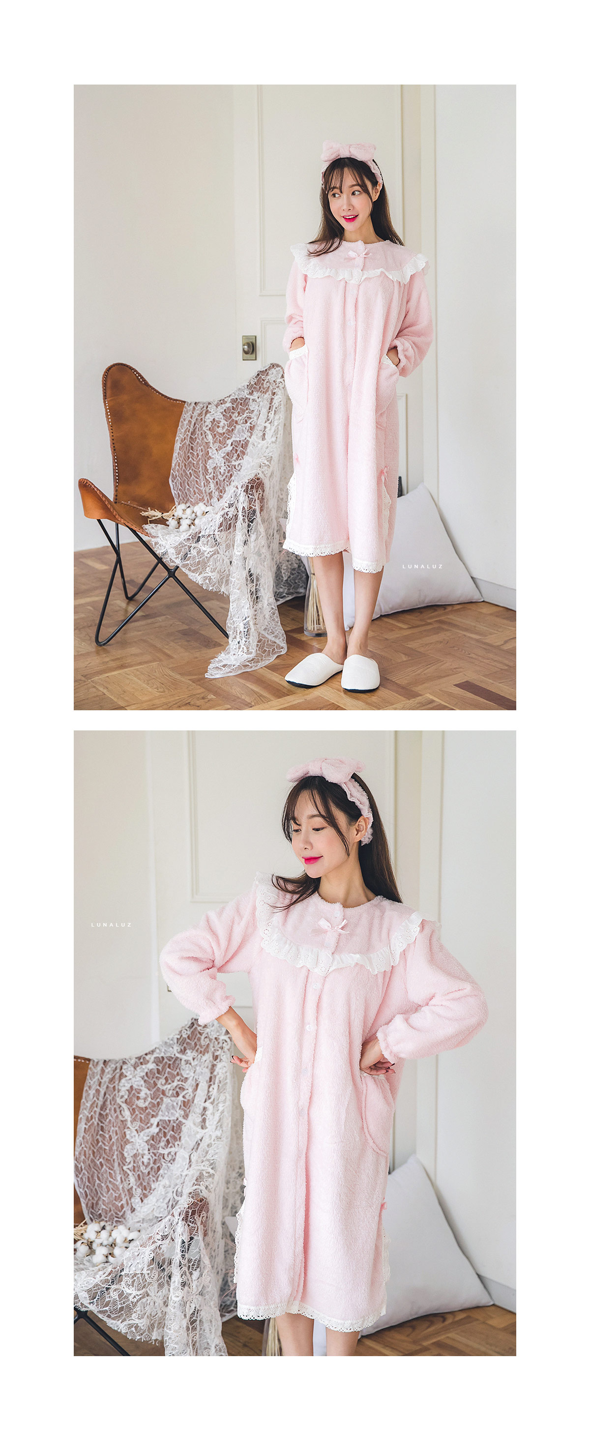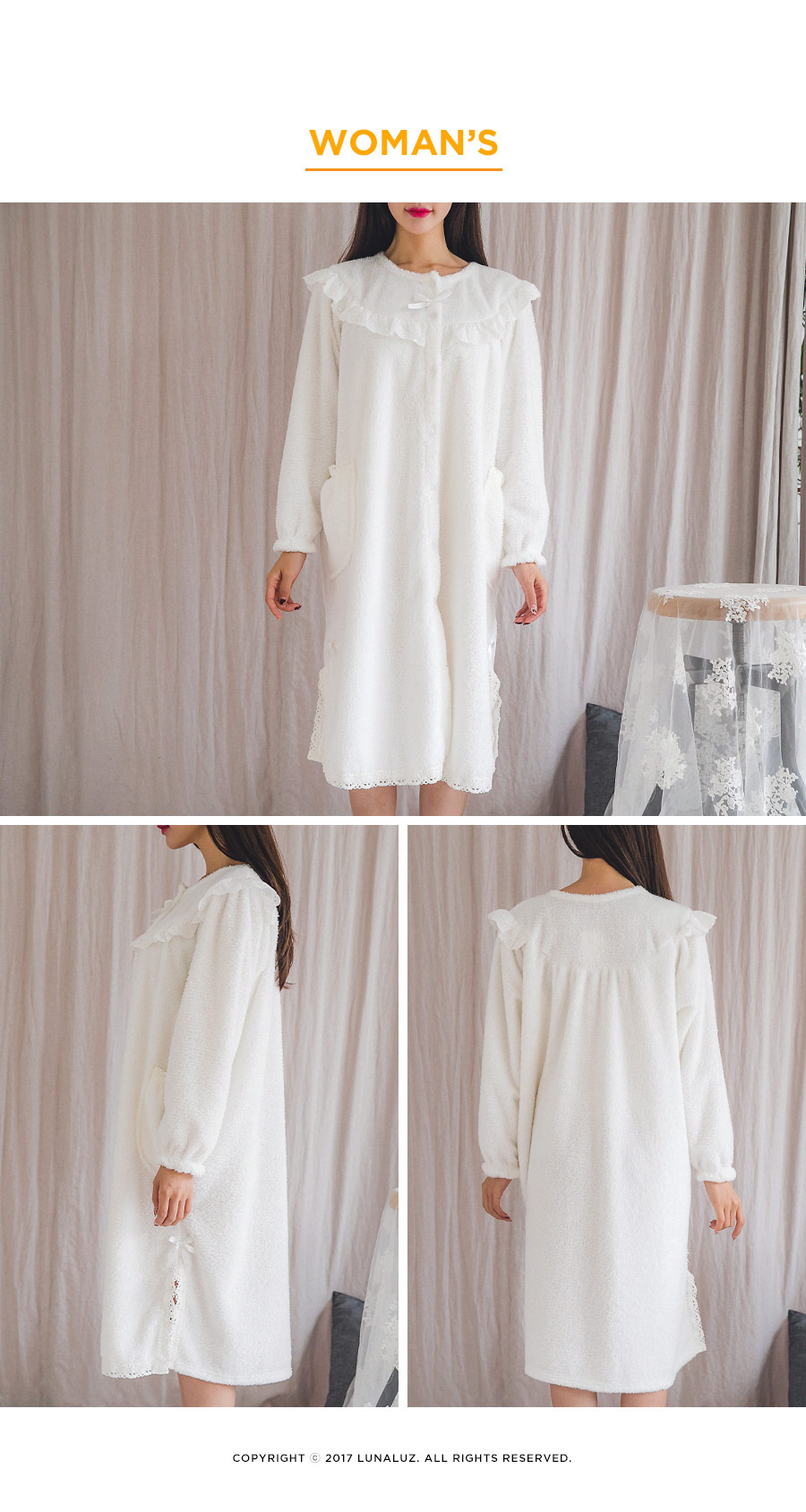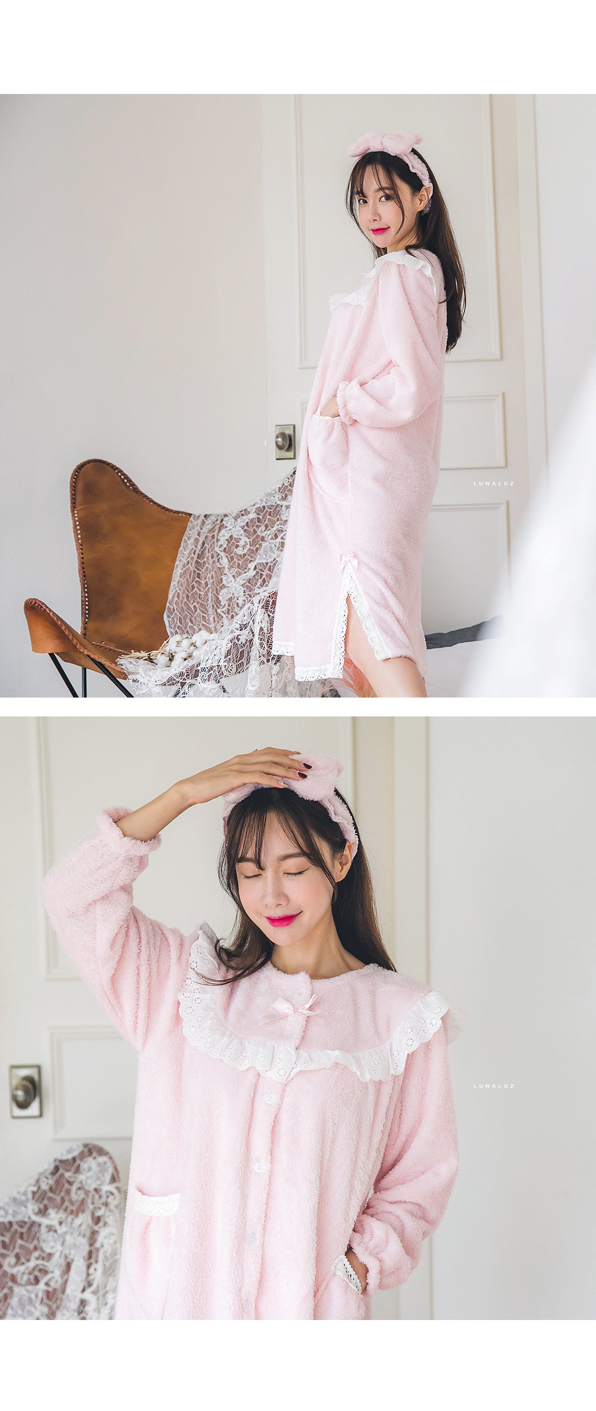 깔끔한 컬러의 보아극세사 원단에 은사를 함께 짜 포인트를 주었습니다. 빛에 따라 은은하게 빛나는 은사와 어우러져 톤 업 효과를 줍니다. 컬러는 여성스러운 무드의 소프트핑크 컬러와 화사한 화이트 컬러 2가지로 제작했습니다. 두께감이 두껍지 않으면서 보온성을 갖춘 보아 극세사 잠옷입니다. DETAIL깔끔한 네크라인 처리와 어깨라인에서 바스트로 이어지는 레이스 장식이 고급스러움을 더해주는데요. 전체 오픈형으로 탈 착용이 좋고, 원피스의 끝단 양 사이드를 절개해 고가의 캐미컬 레이스 장식을 봉제해 포인트를 주었습니다. 리본을 달아 마무리 하고, 포인트 포켓을 달아 디자인했습니다. 팔목에 밴딩 처리를 해 활동성을 높여주었습니다. 전체적으로 소재감이 우아하고 페미닌한 무드가 풍기는 고급스러운 디자인의 잠옷으로 적극 추천해드리고 싶습니다. 100% 국내 제작으로 소재, 디자인, 봉제의 퀄리티가 높습니다.SIZE여성 사이즈는 평균 44반~66 size에게 적합한 free 사이즈 입니다.