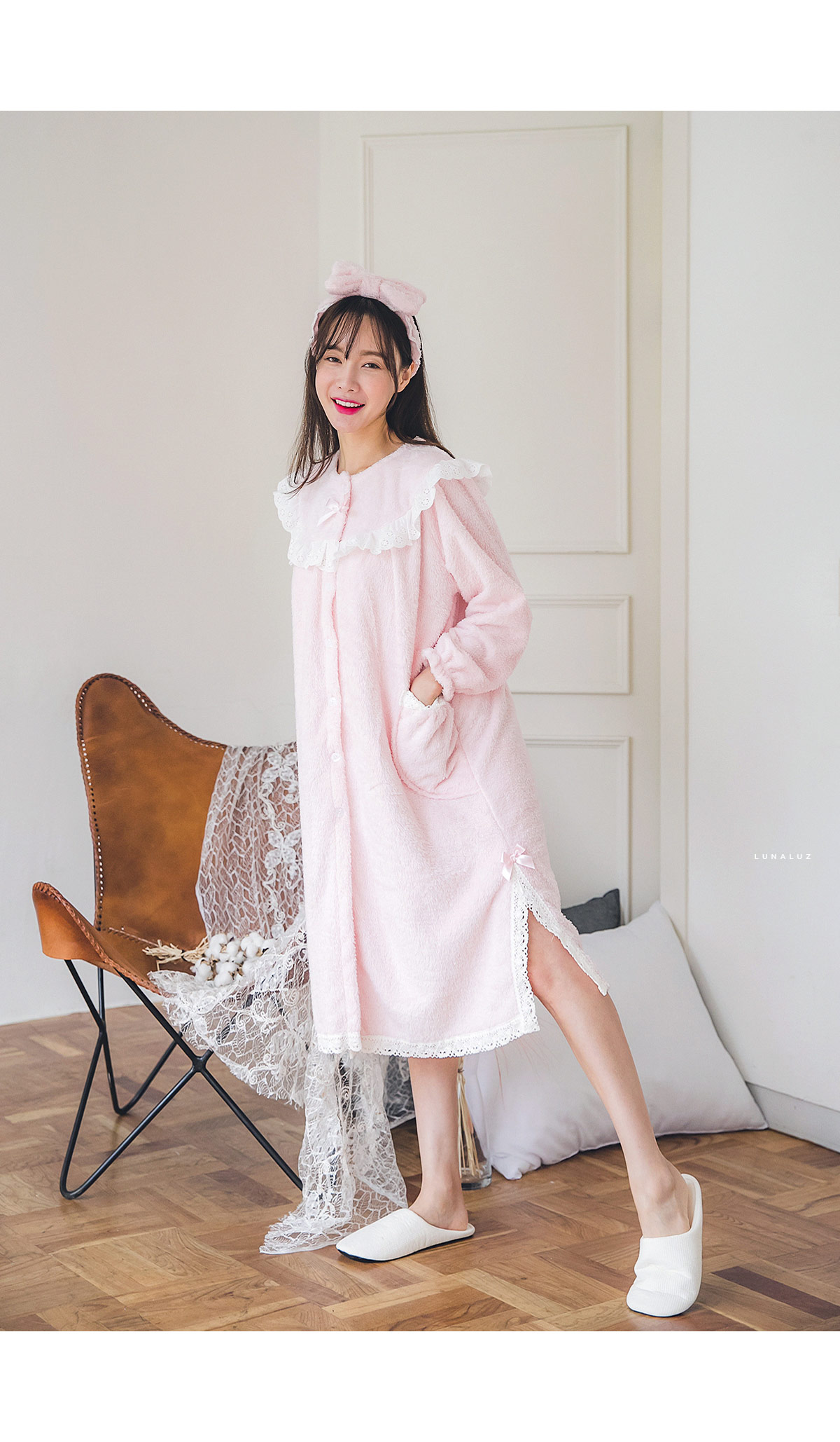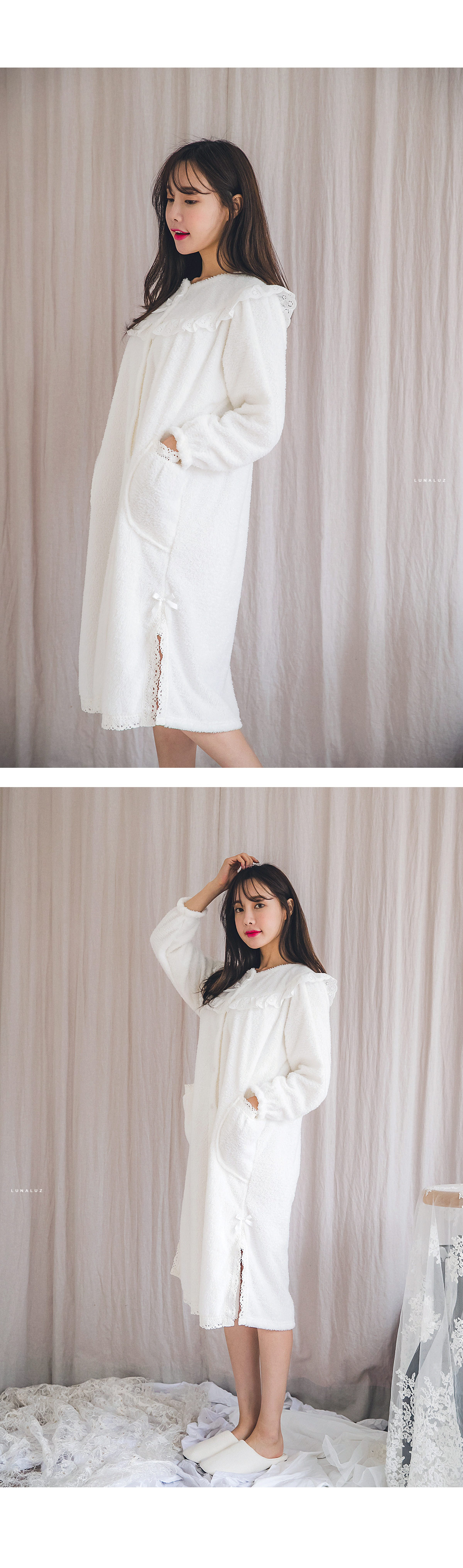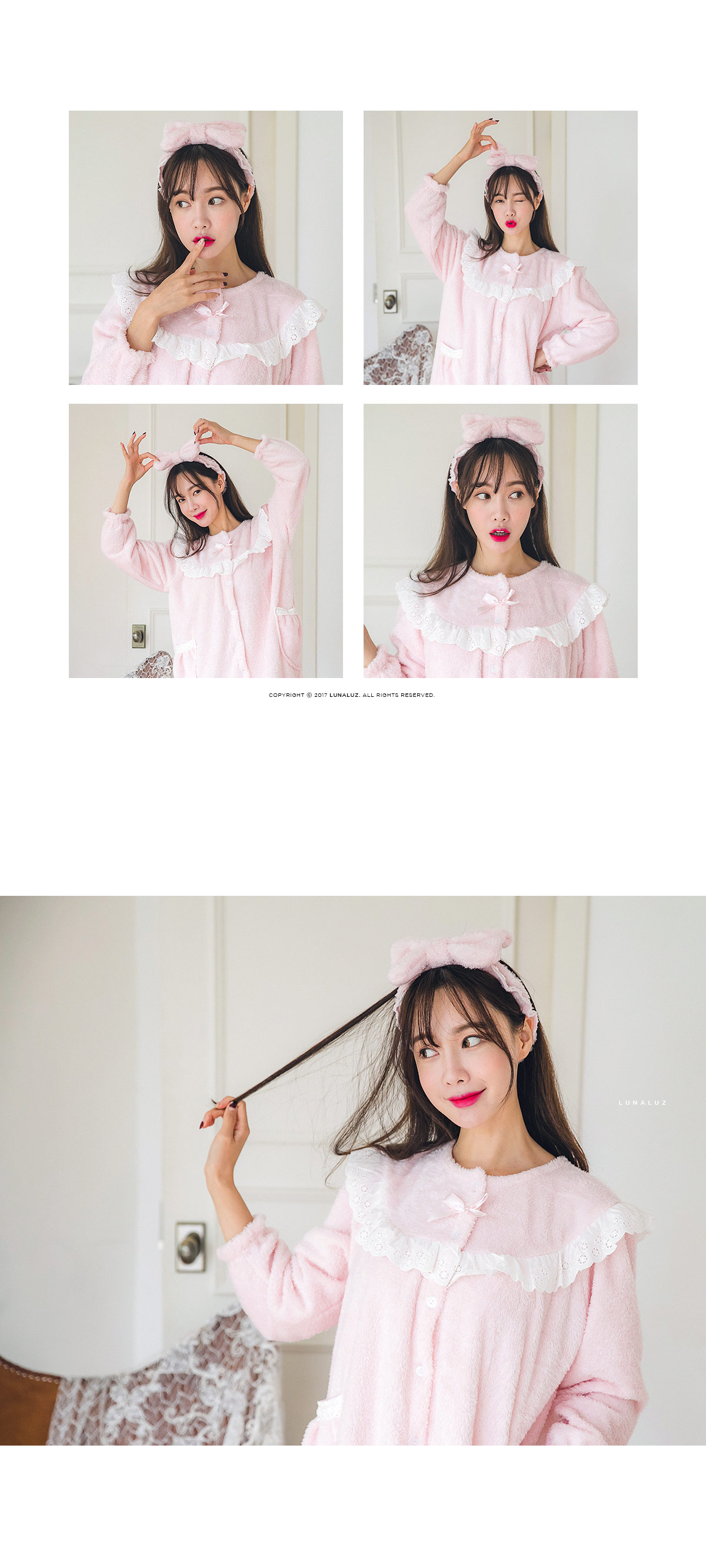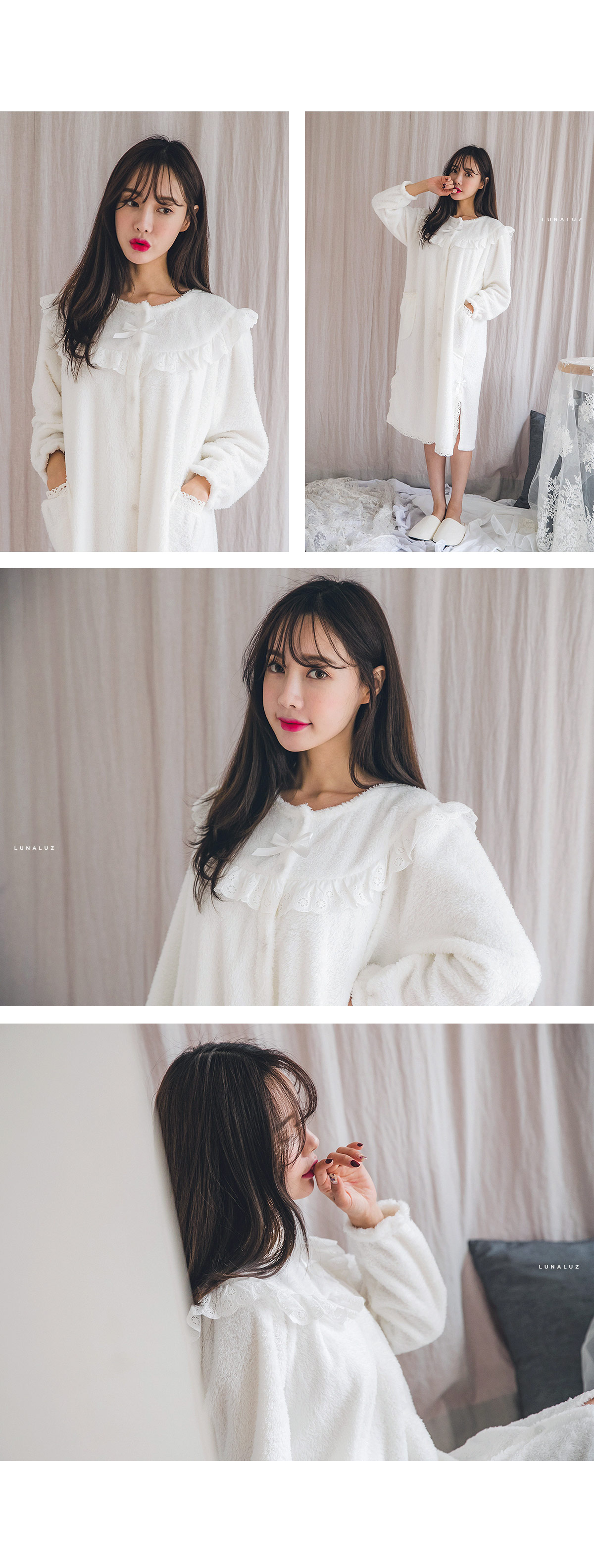깔끔한 컬러의 보아극세사 원단에 은사를 함께 짜 포인트를 주었습니다. 빛에 따라 은은하게 빛나는 은사와 어우러져 톤 업 효과를 줍니다. 컬러는 여성스러운 무드의 소프트핑크 컬러와 화사한 화이트 컬러 2가지로 제작했습니다. 두께감이 두껍지 않으면서 보온성을 갖춘 보아 극세사 잠옷입니다. DETAIL깔끔한 네크라인 처리와 어깨라인에서 바스트로 이어지는 레이스 장식이 고급스러움을 더해주는데요. 전체 오픈형으로 탈 착용이 좋고, 원피스의 끝단 양 사이드를 절개해 고가의 캐미컬 레이스 장식을 봉제해 포인트를 주었습니다. 리본을 달아 마무리 하고, 포인트 포켓을 달아 디자인했습니다. 팔목에 밴딩 처리를 해 활동성을 높여주었습니다. 전체적으로 소재감이 우아하고 페미닌한 무드가 풍기는 고급스러운 디자인의 잠옷으로 적극 추천해드리고 싶습니다. 100% 국내 제작으로 소재, 디자인, 봉제의 퀄리티가 높습니다.SIZE여성 사이즈는 평균 44반~66 size에게 적합한 free 사이즈 입니다.