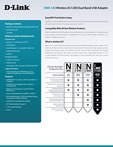 -. Binding : Office Product -. Brand : D-Link -. Feature : Wireless dual band USB Adapter / Next Generation Wi-Fi AC technology for superior wireless performance. / Dual band technology: 2.4GHz (up to 300Mbps) or 5GHz (up to 867Mbps). / Supports USB 3.0 for optimal connection throughput with your laptop or desktop computer (C1 version). / Backward compatible with 802.11n. -. Label : D-LINK SYSTEMS INC -. Manufacturer : D-LINK SYSTEMS INC -. PackageQuantity : 1 -. ProductGroup : Office Product -. ProductTypeName : OFFICE_PRODUCTS -. Publisher : D-LINK SYSTEMS INC -. Studio : D-LINK SYSTEMS INC -. Title : Wireless AC1200 Dual Band USB Adapter