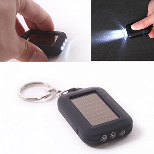Product Description A flashlight is a handy thing to have, but you don't always have room to carry one around, or batteries to power it. Kill two birds with one stone with a solar-powered keychain flashlight. 3 bright LED bulbs provide light when the side button is pressed and are powered by a few hours in the sun. The convenient travel size and keychain ring make this the perfect travel accessory for those emergency situations. 0